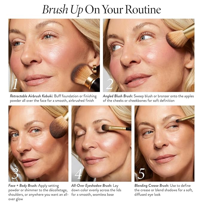 - HOW TO USE: Retractable Airbrush Kabuki Brush: Swirl or dip the brush into powder and gently tap off any excess. Apply to skin using sweeping, circular motions. For fuller coverage, apply using a patting motion. Angled Blush Brush: Sweep blush or bronzer across the apples of your cheeks and blend out toward your hairline. Classic Bronzer Brush: Sweep the bristles over the high points of the face for an all-over glow. All-Over Eyeshadow Brush: Glide the brush over shadow and sweep it across lid