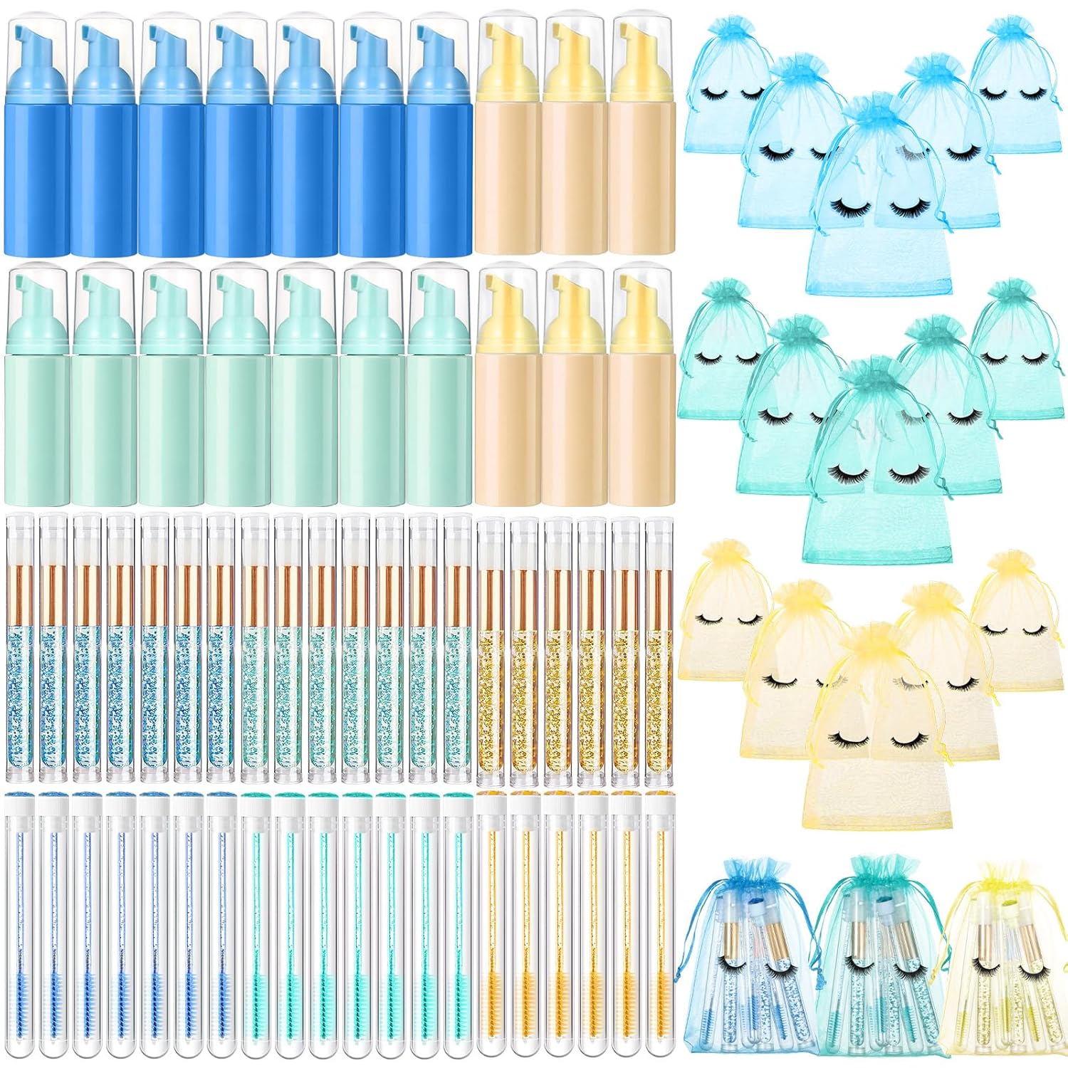 Zhehao 80 Pcs Lash Shampoo Bottle Brushes Kit 20 Foam Pump Dispensers 20 Lash Shampoo Brushes 20 Eyelash Aftercare Bag 20 Cleaning Pipes, Eyelash Extension Supplies (Multicolor)