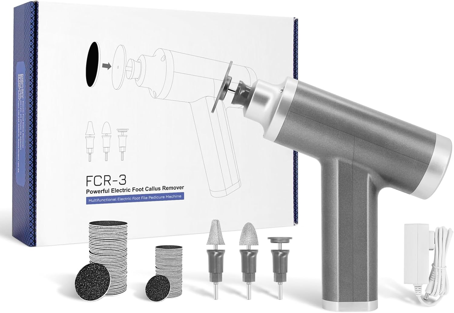 - PACKAGE DETAILS: 1pc professional FCR-3 electric foot callus remover (gray), 1pc big round grinding head (use with big sandpaper), 1pc small round grinding head (use with small sandpaper), 2pc tapered grinding heads (no need sandpaper), 60pcs big sandpaper discs, 20pcs small sandpaper discs.