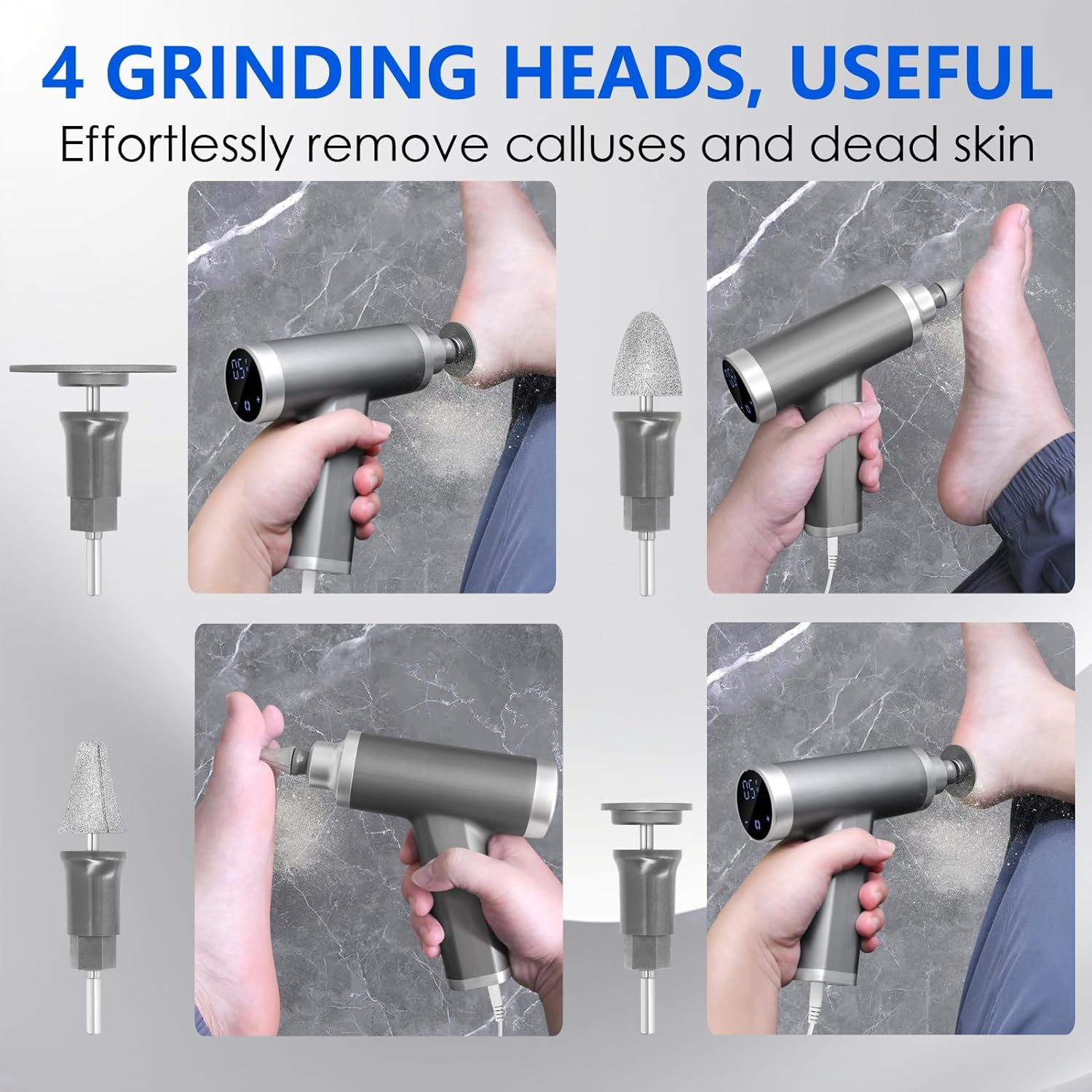 - 4 REPLACEABLE GRINDING HEADS: This professional electric foot callus remover comes with 4 grinding heads, 1 big round and 1 small round grinding head (requires sandpaper), and 2 metal cone-shaped grinding heads (no sandpaper needed). They can remove dead skin and calluses from any area of your feet.