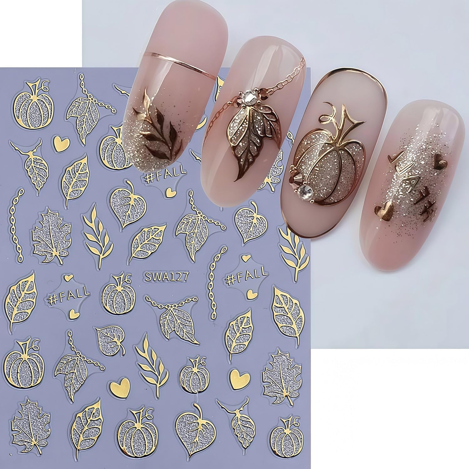 - Quantity: You will get 2 sheets of gold fall maple leaves nail art stickers, including Gold maple leaves and pumpkin designs, not easy to fall off or fade, can easily create a variety of themed nail art, meet various nail art needs
